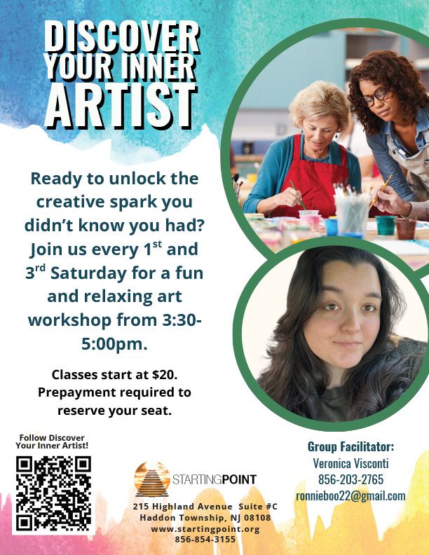 Discover Your Inner Artist Veronica Visconti’s Discover Your Inner Artist group on the Starting Point. Join us every 1st and 3rd Saturday. + Add to Google Calendar + iCal / Outlook export Date Sat. - Oct 18 2025 Time 3:30 pm - 5:00 pm Category Meetings
