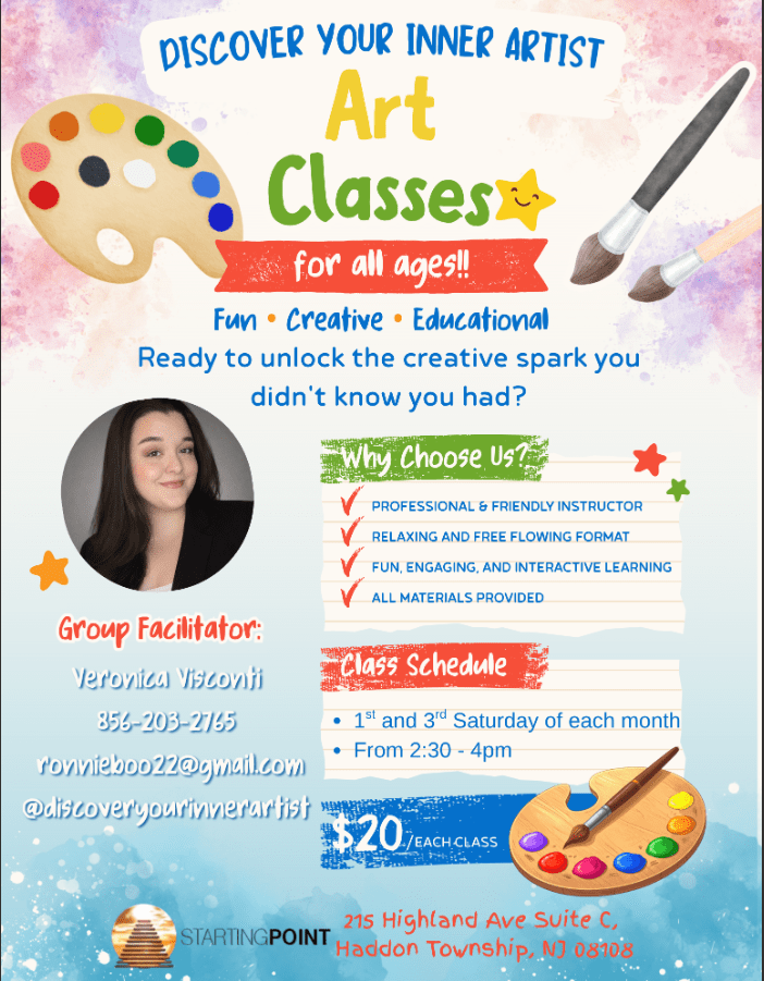 Discover Your Inner Artist Veronica Visconti’s Discover Your Inner Artist group on the Starting Point. Join us every 1st and 3rd Saturday. + Add to Google Calendar + iCal / Outlook export Date Sat. - May 02 2026 Time 2:30 pm - 4:00 pm Category Meetings
