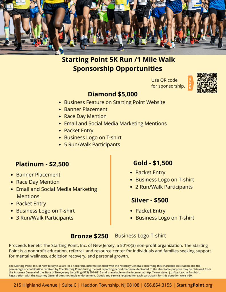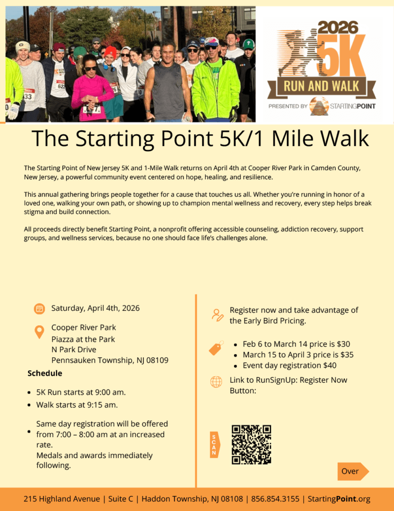 The Starting Point 5K/1Mile Walk Registration link: https://runsignup.com/Race/NJ/Pennsauken/TheStartingPoint5K Sponsorship link: https://www.zeffy.com/en-US/ticketing/5k-run-and-walk-2026-sponsorship-opportunities + Add to Google Calendar + iCal / Outlook export Date Sat. - Apr 04 2026 Time 9:00 am Location Cooper River Park Piazza at the Park N Park Drive Pennsauken Township, NJ 08109 Category Events